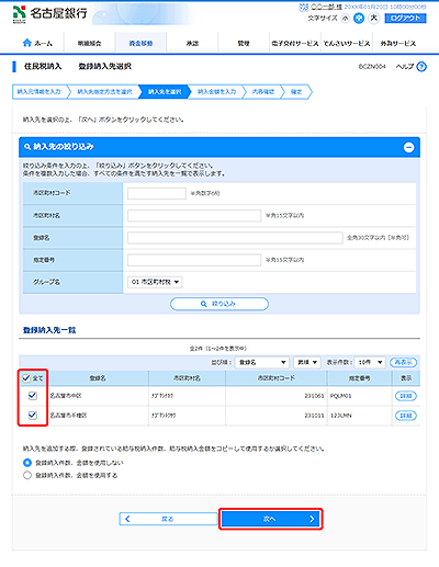 納入月(指定日)、支払口座を選択し、[次へ]ボタンをクリックしてください。