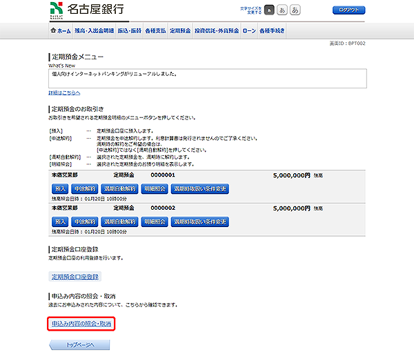 ※定期預金預入の申込み内容を照会する場合を例にご案内します。