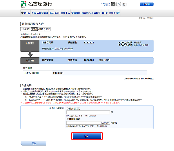 外貨普通預金口座への入金を行います。