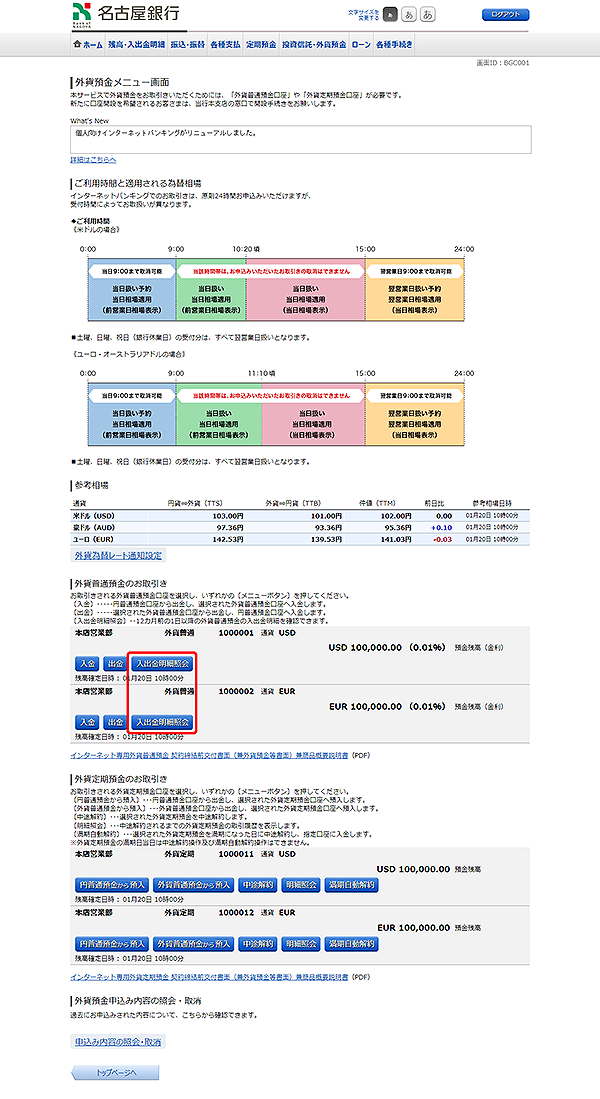 入出金明細を照会する外貨普通預金口座の[入出金明細]ボタンをクリックしてください。