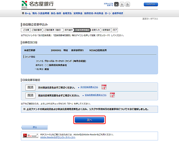 交付目論見書をダウンロードして内容をよくお読みのうえ、[次へ]ボタンをクリックしてください。