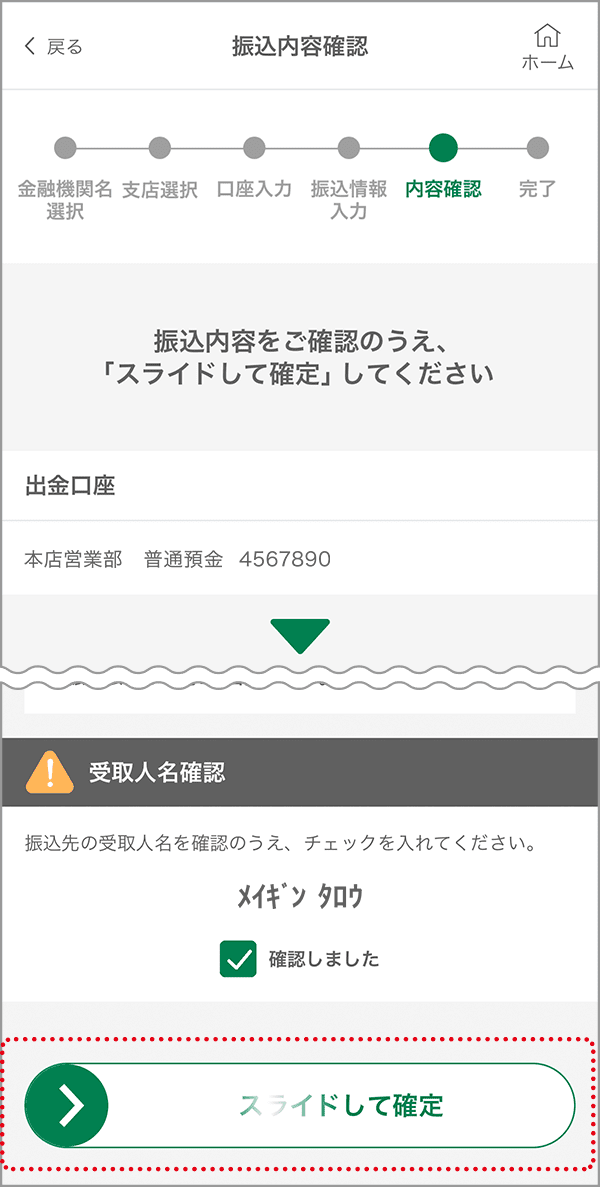 振込内容をご確認のうえ、「スライドして確定」をスライドしてください。